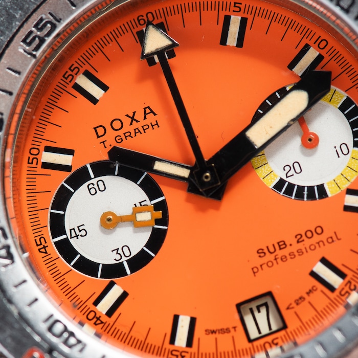 This particular example, however, is not your typical DOXA Sub. This piece is a 200 T.Graph, which adds the complication of a chronograph into the mix — and a manual winding one at that.