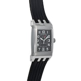 This particular Reverso, a Gran Sport model, features 27mm x 43mm reversible steel case, a textured grey dial with luminous Arabic indices and a matching luminous sword handset, a signed screw-down crown, and an automatic-winding movement within. It’s fitted to a signed rubber strap with a signed steel deployant buckle — a unique look for a watch that’s typically found on leather or on a steel bracelet.