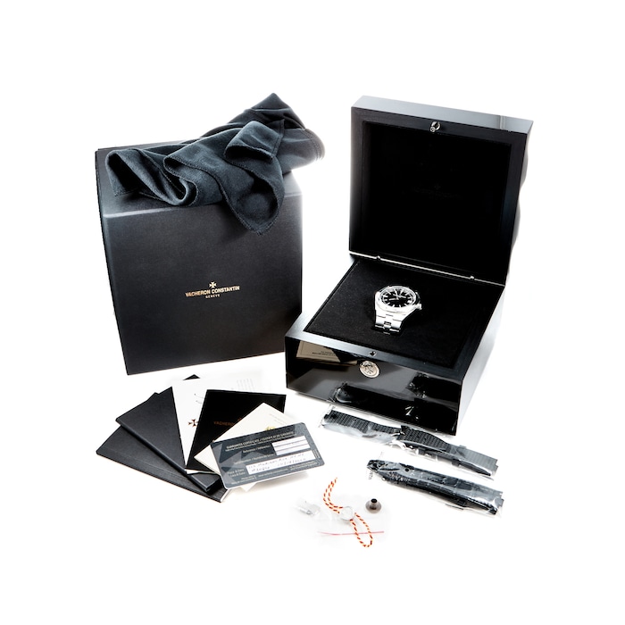 This particular example, an Overseas Reference 4500V, dates to 2020 and features a solid stainless steel case with an integrated style (but easily swappable!) bracelet, stylized bezel, and a stunning gloss black dial.